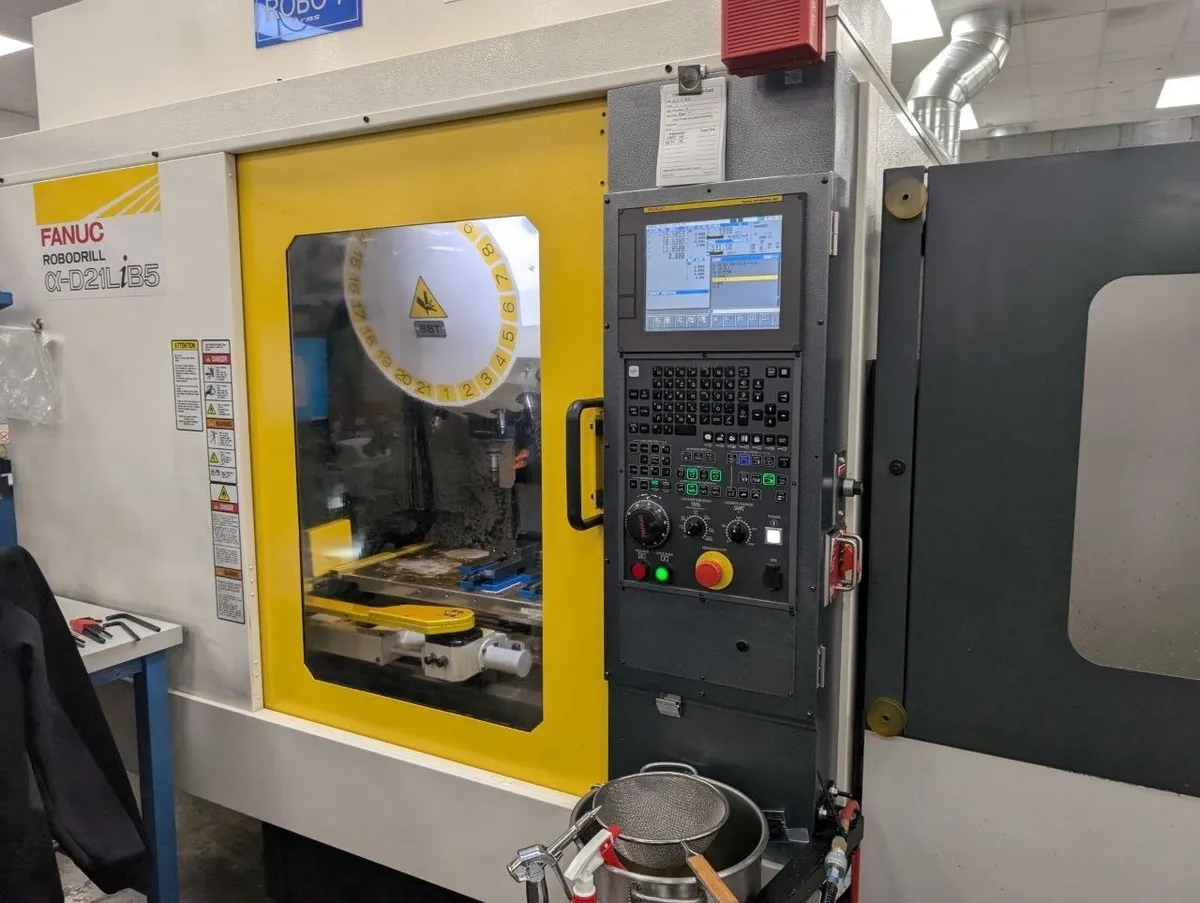 2018 FANUC ROBODRILL ALPHA D21LIB5. CNC drilling and tapping center with 27.55" X, 15.748" Y, 12.99" Z travel. 24,000 RPM spindle speed. Features include Blum probe, laser tool setter, mist collector, and automatic pallet changer. 21 ATC tool magazine.