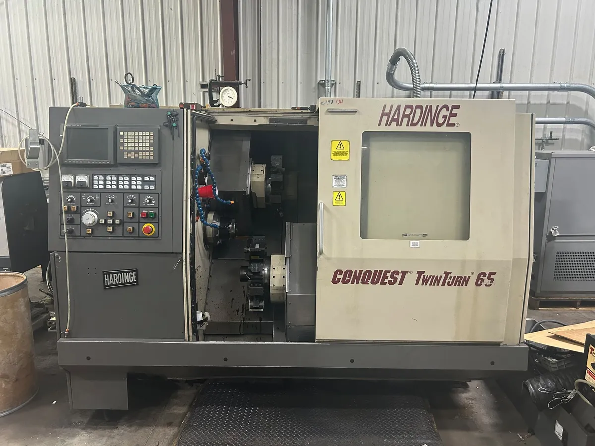 For sale: 2002 Hardinge Conquest Twin Turn 65 CNC Lathe. Features 19.45" swing, 25 hp, max RPM 8,000, 17.72" turning dia, sub spindle, dual turrets, Fanuc 18i control, chip conveyor, and LNS Quickload Bar Feed. Perfect for precision tasks.