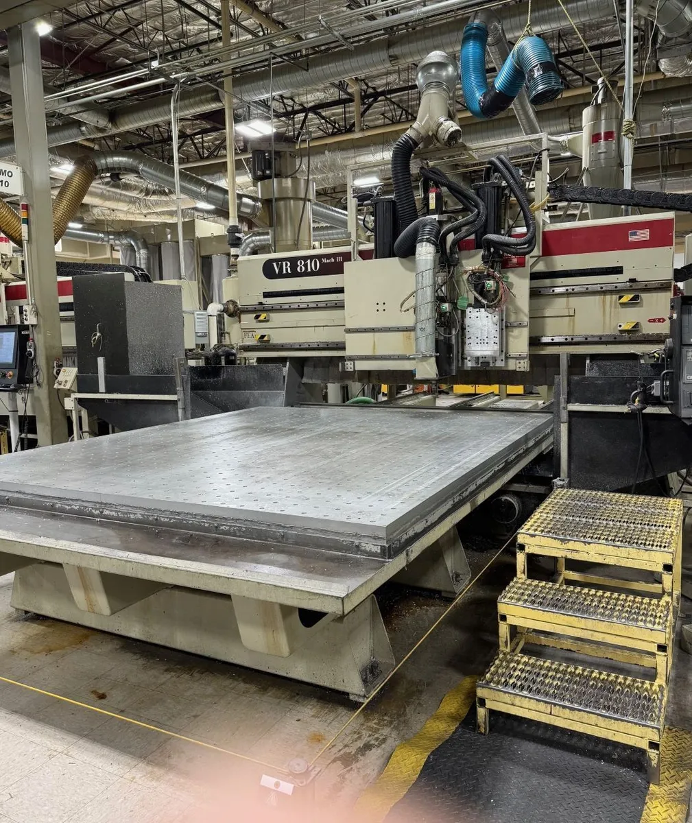 2006 KOMO VR 810 MACHIII CNC Router, equipped with (2) 30,000 RPM Heads, GE Fanuc Panel i Controls, HSK-50 Spindles, and Chip Blaster Coolant Filtration System. Includes Koolant Koolers and dust collector. Table size: 102” x 120”.
