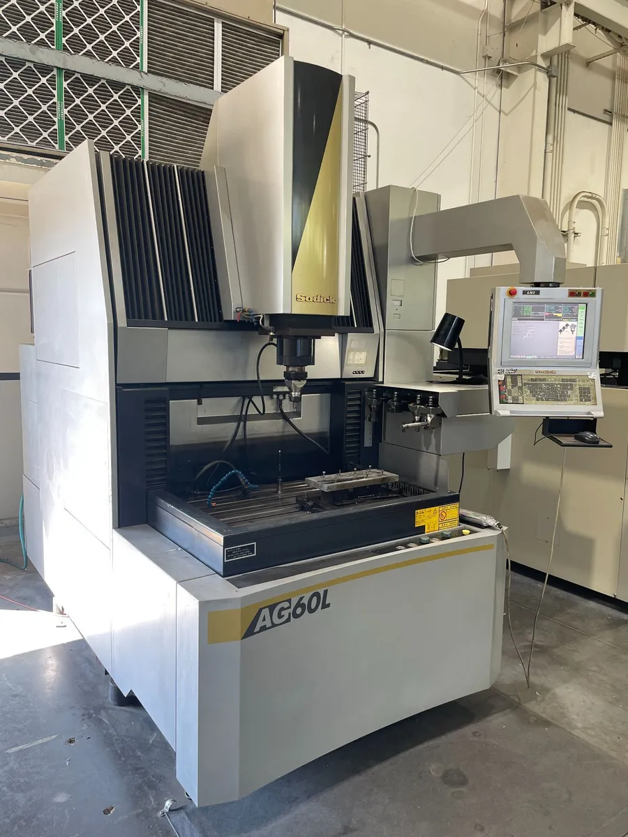 SODICK AG60L EDM Sinker, used. Table: 29.53"x21.65"; Tank: 41.34"x27.95"x18.11". Load: 3,307 lbs. Travels: 23.62"x16.54"x14.57". Features: LN2 Control, 4 Axis burn, 15" Touch Screen, 6 ATC, 3R Macro chuck. Machine weight: 10,912 lbs.